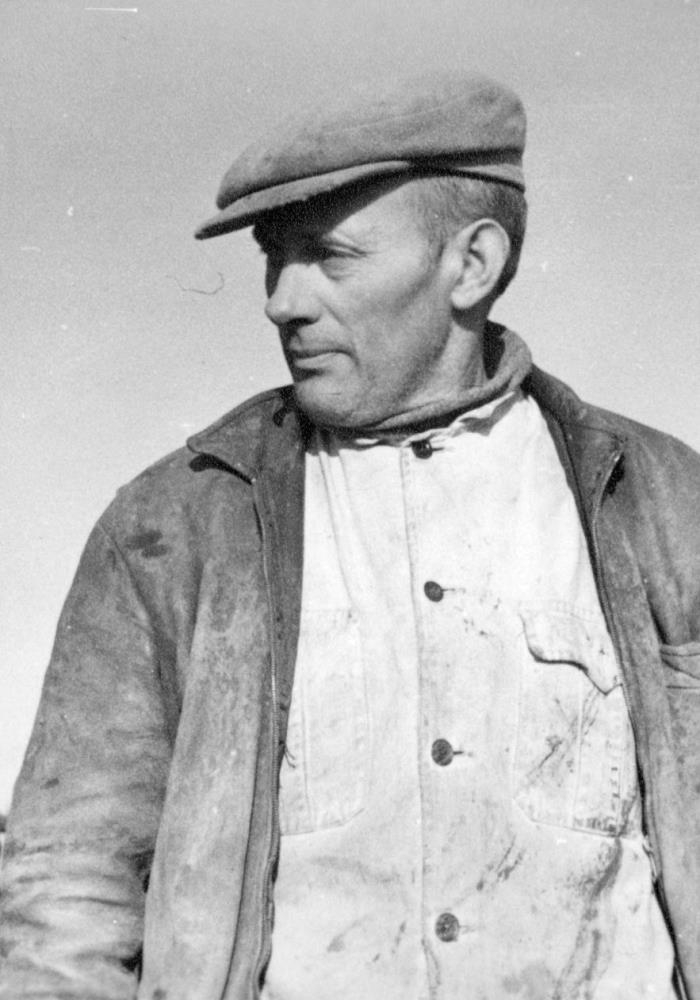 Jón Steingrímsson, sjómaður, klæddur hefðbundnum vinnufötum miðjar 20. aldar. Undir dökkum jakka er ljós vinnujakki og sixpensari er á kolli hans.