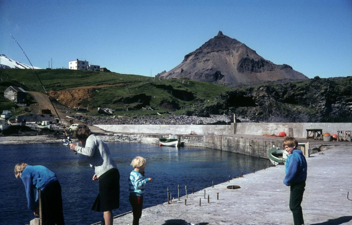 Hellnar. Kona og krakkar á bryggju að veiða. Sér til íbúðarhúsa í brekku. Karitas, Aðalsteina, Guðríður og Svanfríður.