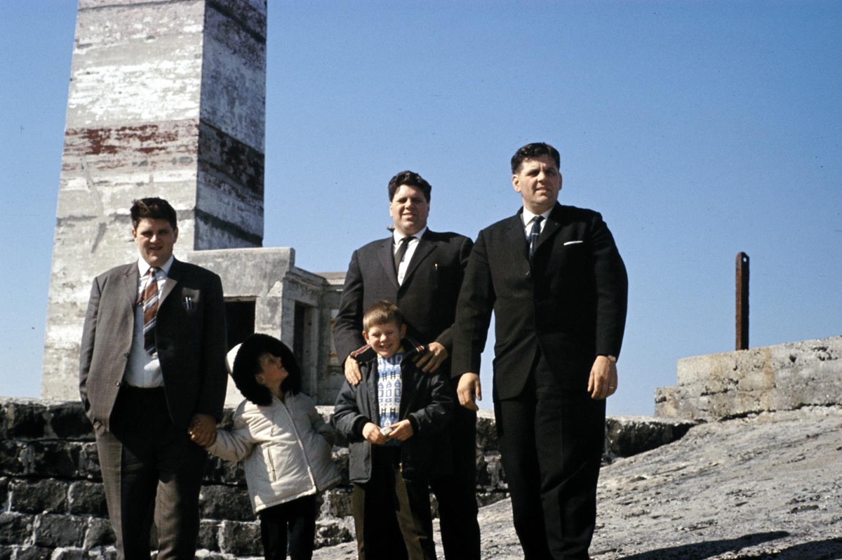 Bræðurnir frá Krókvelli í Garði út við gamla Garðskagavitann ásamt ungum drengjum. Frá vinstri: Árni, Eggert og Þorsteinn Gíslasynir. Drengirnir heita Haraldur Árnason og Ólafur Eggertsson.