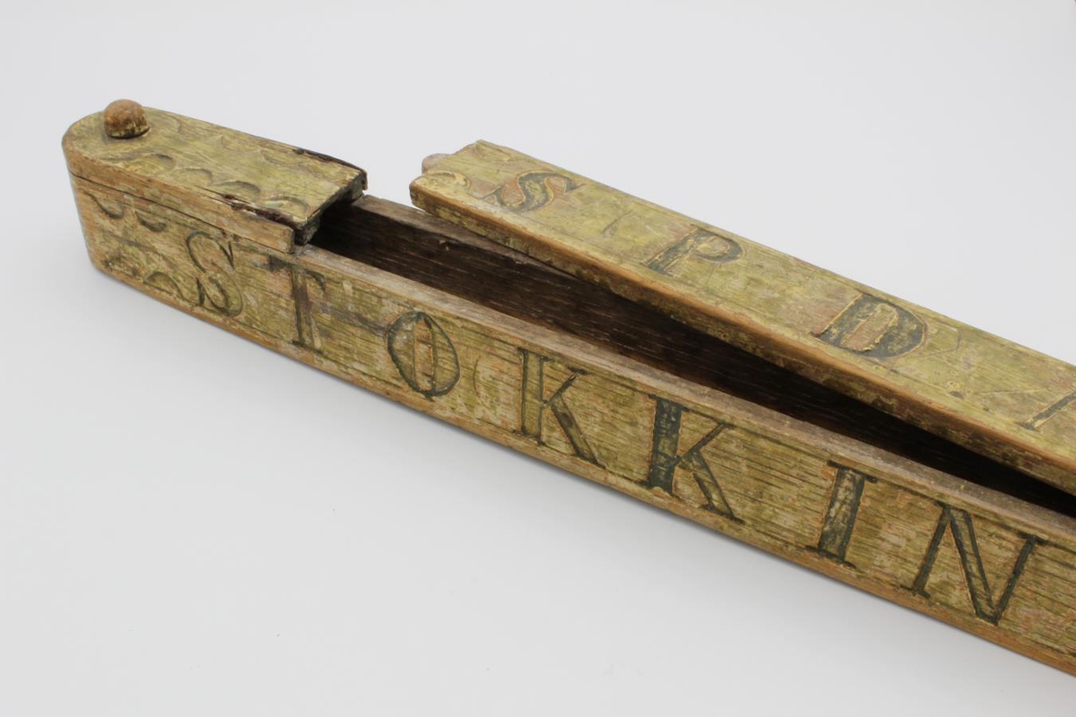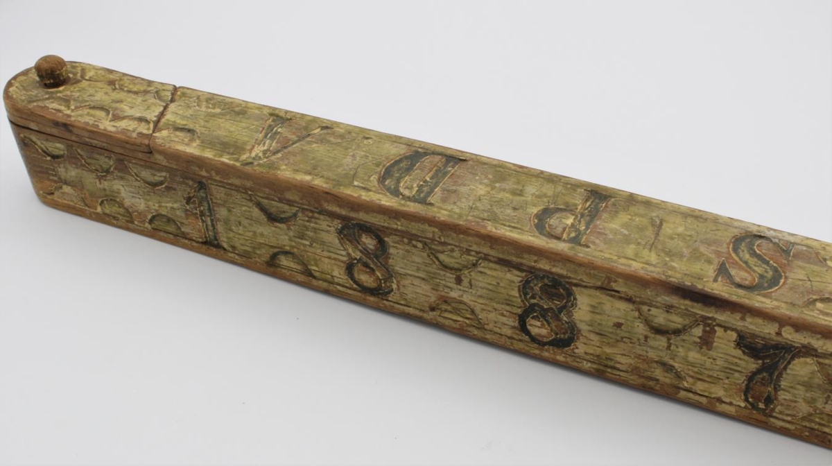 Prjónastokkur útskorinn; á hann eru grafnir stafirnir: S.P.d. á 1887. Steinunn Pálsdóttir var frá Vatndal á Stokkseyri.