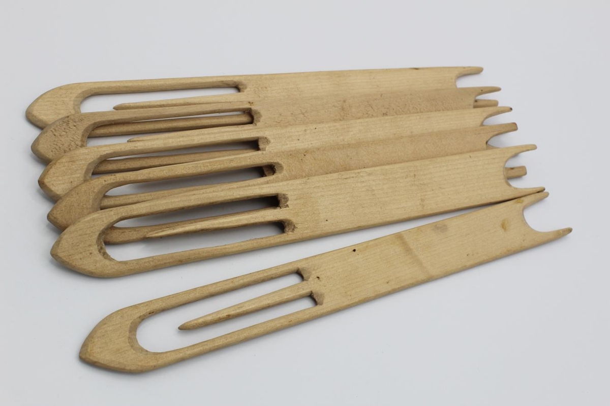 úr tré 26,5 x 3,0 sm. Þykkt plötu 0,5 sm. Sex stykki sem merkt voru sama