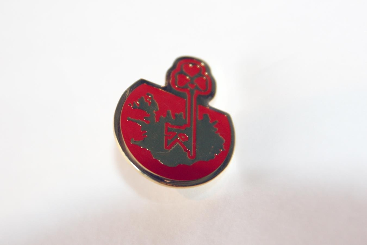 K lykill Kiwanishreyfingarinnar, gulllitað og óreglulegt í laginu með áprentuðu rauðu merki.
