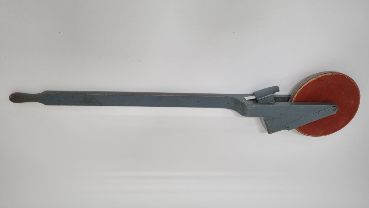 Sáningarhjól fyrir gulrófur. Er allt úr tré. Rautt hjól með járnlista liggur á öxli úr tré, og í framhaldi af því skaft með handfangi í enda. Við öxulinn er hólf fyrir rófukornin. Öxullinn og skaftið er grámálað. Notað til að sá rófum. Kristjón var mjólkurbílstjóri á Skeiðum þegar Hinrik í Útverkum gaf honum sáningarhjólið.