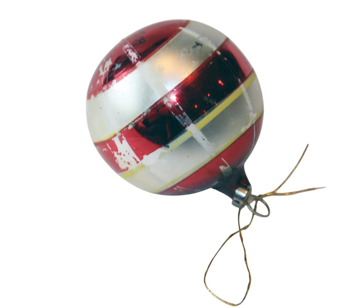 Rauð jólakúla með hvítri breiðri rönd og fínlegum gulum og hvítum röndum