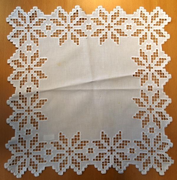 Harðangursdúkur, hvítur. Laufey Indriðadóttir frá Ásum kom með þetta lín sem var frá Maríu Hansdóttur móður bræðranna á Kópsvatni. María bjó þar 1932-1945.