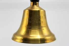 Stór borðbjalla með svartlökkuðu viðarskafti. Kólfur silfurlit kúla. Grafið í bjöllu: E/S ESJA 1923-1938 Leifur Kr. Erlendsson Framreiðslumaður.