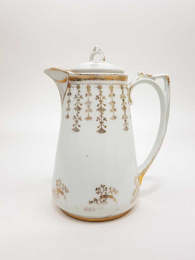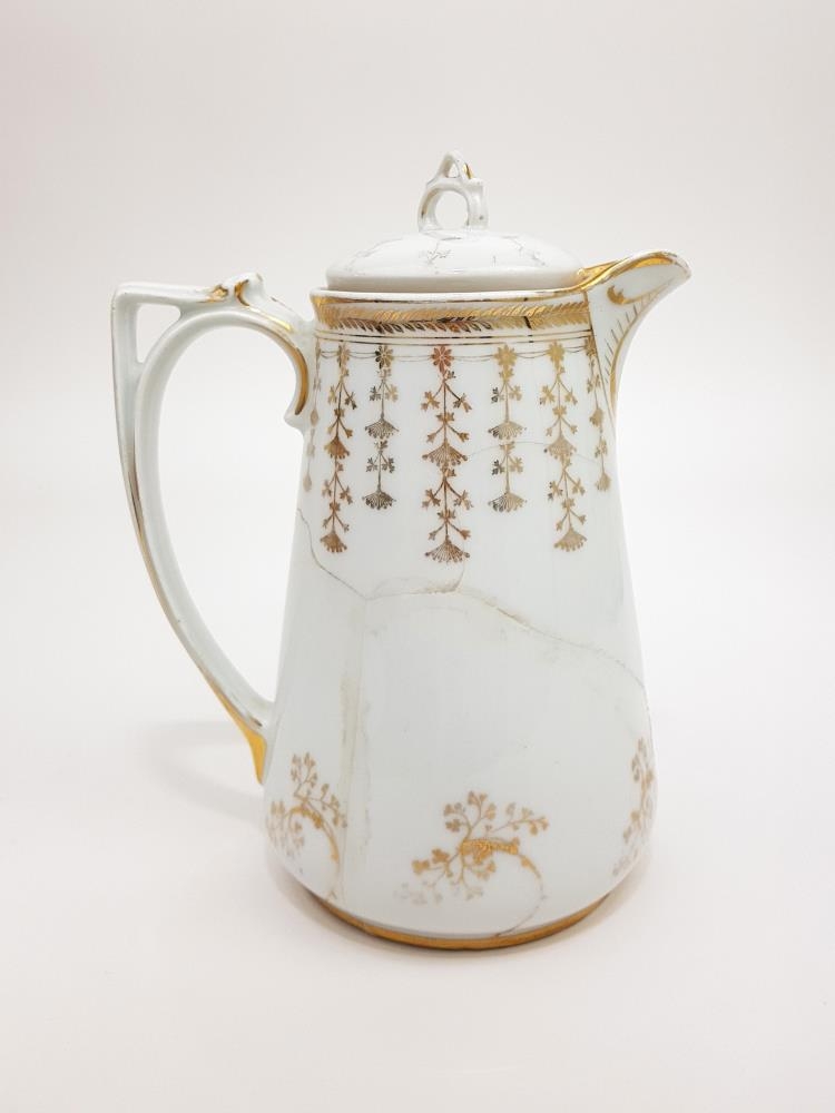Kanna. Kakókanna með gylltu blómamynstri. Handfangið er mikið og skreytt. Lokið er einnig skreytt og með hanka. Kannan hefur brotnað og er viðgerð á annari hlið. Úr dánarbúi Vilborgar Sæmundsdóttur og Guðmundar Jónssonar í Einarshúsi á Eyrarbakka.