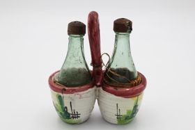 tappi). Flöskurnar eru í körfu úr leir með handmálaðari litmynd. Límmiði