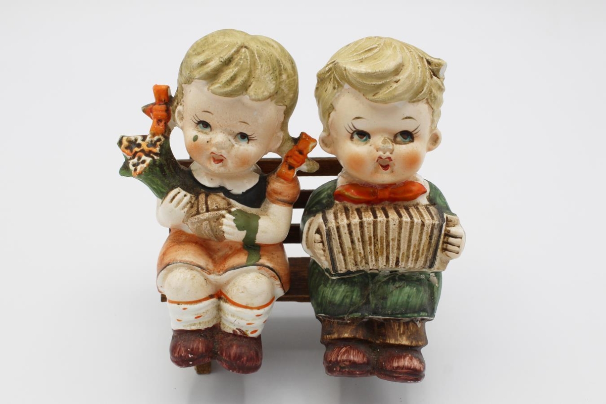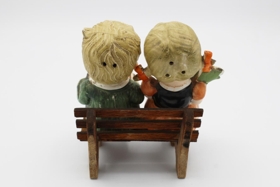 og strákur og er strákurinn viðgerður. Þau sitja á stökum trébekk. Staukarnir