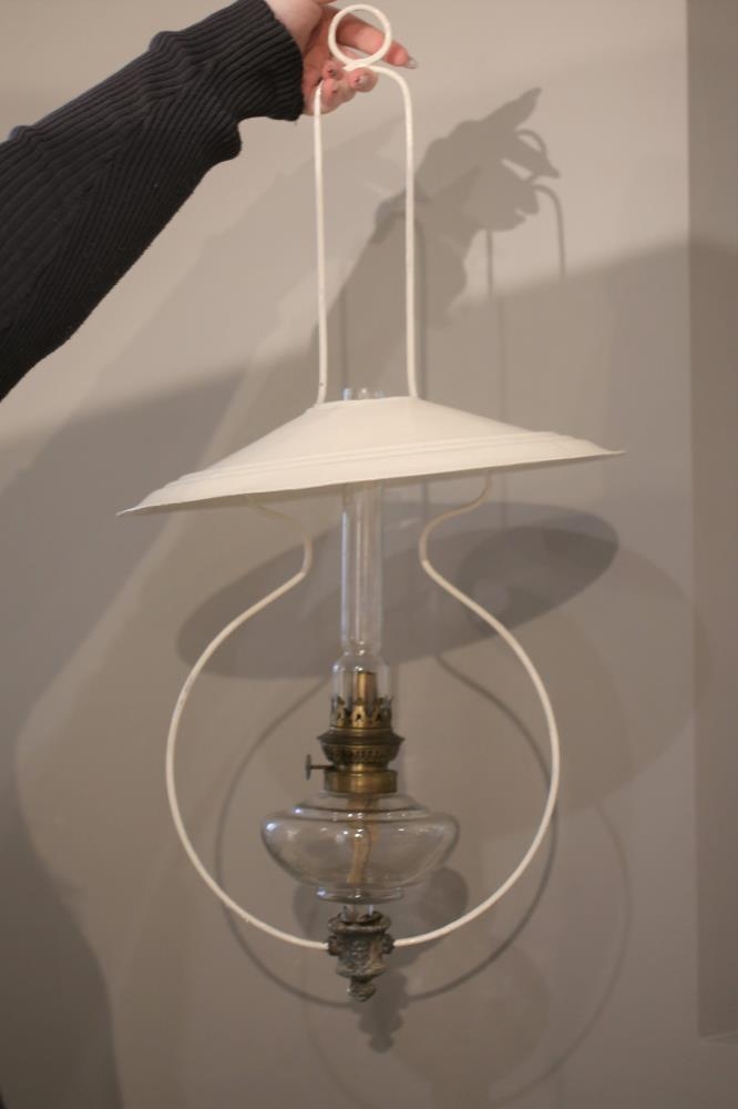 Hvítmálaður olíulampi úr járni og kopar blöndu á glerflösku. Gerður til að hengja upp. Úr búi mæðginanna Aðalheiðar Sigurðardóttur og Karls Jónssonar á Galtastöðum fram í Hróarstungu.