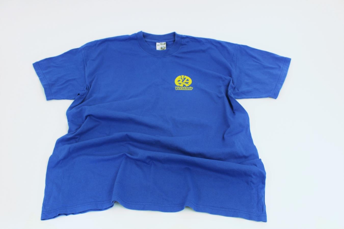Blár bolur með gulu merki "KÁ verslanir". Stærð XXL Afhent safninu að frumkvæði safnstjóra.