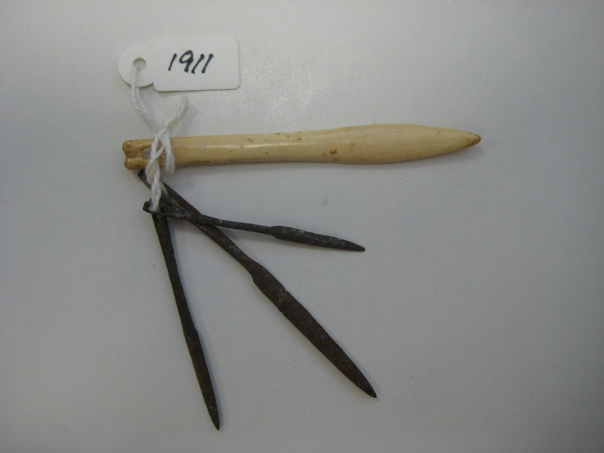 Þrjár nálar úr járni ryðgaðar, 4,0- 4,5 og 6,0 sm og ein beinnál gróf, 6,5 sm.
