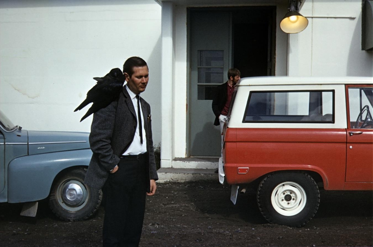 Lóranstöðin. Gufuskálar. Maður við hús og bíl og er annar með hrafn á öxlinni. Birgir Óskarsson og Þórður Markússon