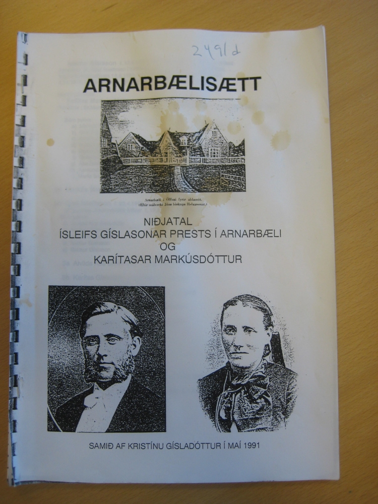 Númer 2491: Kistill, brúnn 18,0 x 12,3 x 7,4 sm. Mahoníviður, rauð fóðring úr pappír að innan. Læsing, lykil vantar. Í kistlinum var: 2491A: Tvær viðskiptamannabækur milli Kartíasar og Zöllners-verslunar. Kvittanir, boðskort, þakkarkort og minnismiðar. 2491 B: Bréf milli séra Ísleifs Gíslasonar í Arnarbæli í Ölfusi og konu hans Karítasar Markúsdóttur. 2491 C: Saumuð pjatla, bakgrunnurinn er svartur, og svo er blóm og karfa. Smágerður saumur, krosssaumur. 2491 D: Niðjatal Ísleifs Gíslasonar prests í Arnarbæli í Ölfusi og Karítasar Markúsdóttur (varðveitt í öskju 22). 2491 A og 2491 B fóru á Héraðsskjalasafn Árnesinga. Úr búi Ingibjargar Ísleifsdóttur. Efni bréfanna: Árið 1873 fór séra Ísleifur til Kaupmannahafnar með elsta son þeirra Markús sem var veikur, bréfin eru frá honum til Karítasar.