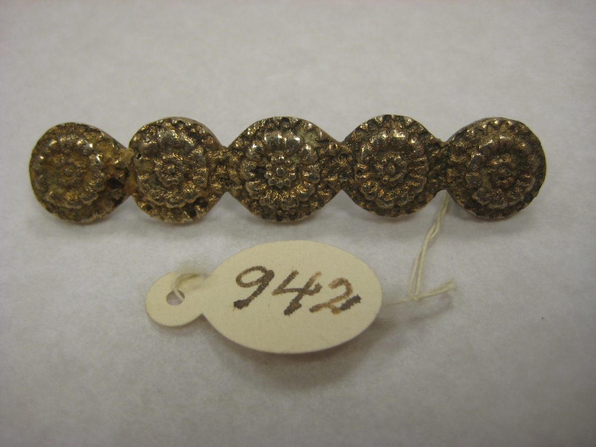 Slifsisnæla (eða brjóstnæla) gyllt úr steypu, lengd 6,0 sm. Samanstendur af 5 rósadoppum. Úr eigu Valgerðar Ögmundsdóttur ljósmóður á Kröggólfsstöðum í Ölfusi.