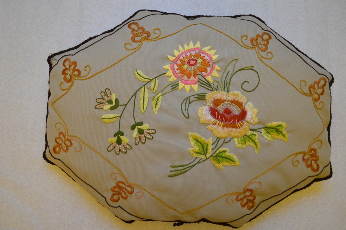 Sófapúði, saumaður í litum, blómstursaumur. Grunnlitur er grár. Áttstrendur. Lengd 50 cm, breidd 40 cm. Verk Sigurveigar Jónasdóttur í Vorhúsum. Sent frá Eyrarbakka.