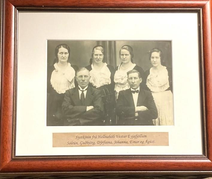 Innrömmuð ljósmynd af Hellnahólssystkinum u. Eyjafjöllum, Sólrúnu, Guðbjörgu, Dýrfinnu, Jóhönnu, Einari og Ágústi Ingvarsbörnum.