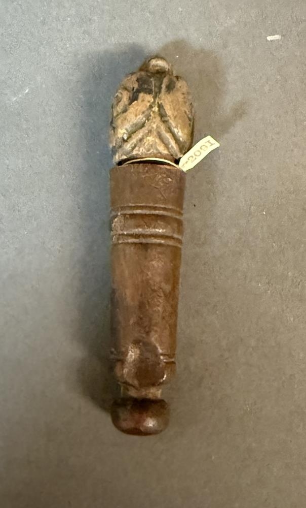 Nálhús úr mahóní, rennt. Lokið skorið út sem hundshaus ( bolabítur ). Þetta á ekki saman og er lokið án efa útlent.
