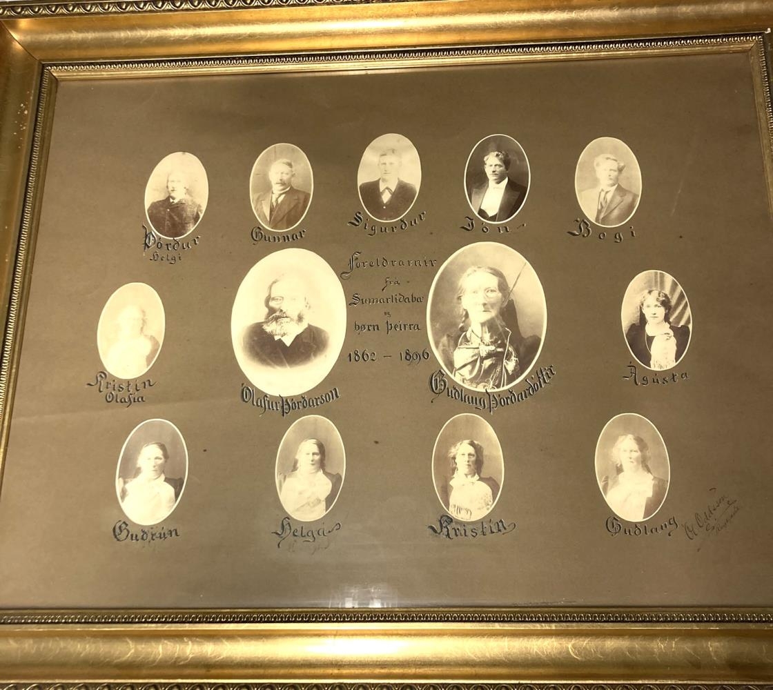 Innrammað myndaspjald með myndum Ólafs Þórðarsonar í Sumarliðabæ, Guðlaugar konu hans og barna þeirra. Myndirnar nokkuð máðar af sólarbirtu.