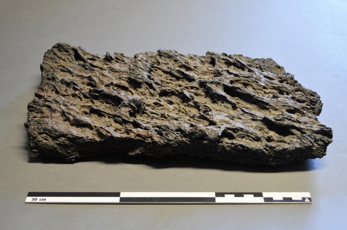 Hraunhella úr bæjarrúst í Bólhraunum á Mýrdalssandi, stærð 34 x 18 cm, þykkt um 3 cm. Gef. Vilhjálmur Eyjólfsson á Hnausum.
