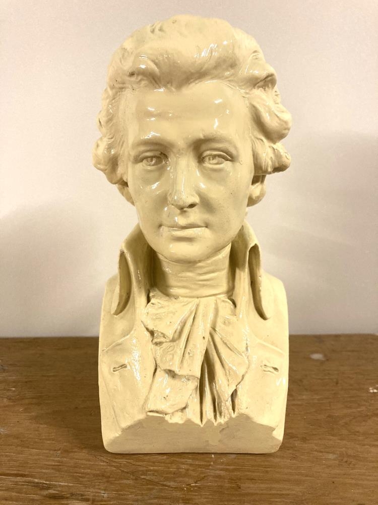 Mozart, brjóstlíkan úr keramik, rjómagult að lit. Merkt D.S. á bakhlið.