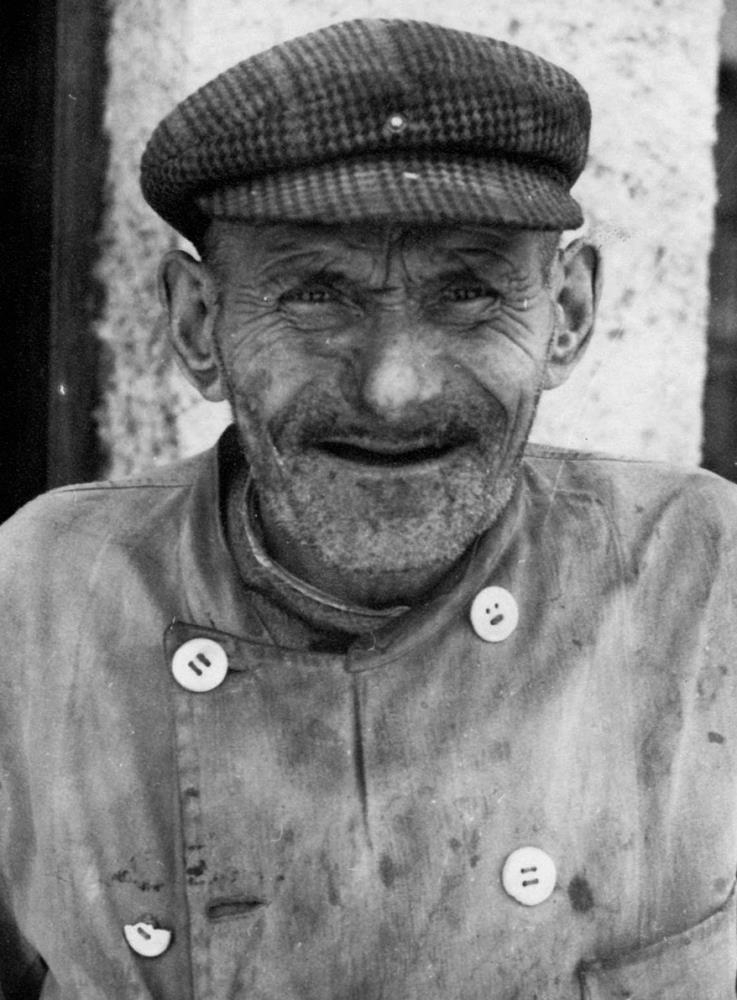 Jóhannes Jónsson truflaður augnablik við vinnu sína á meðan hann stillir sér upp og brosir fyrir ljósmyndun. Jóhannes er klæddur tvíhnepptum vinnujakka með sixpensara.