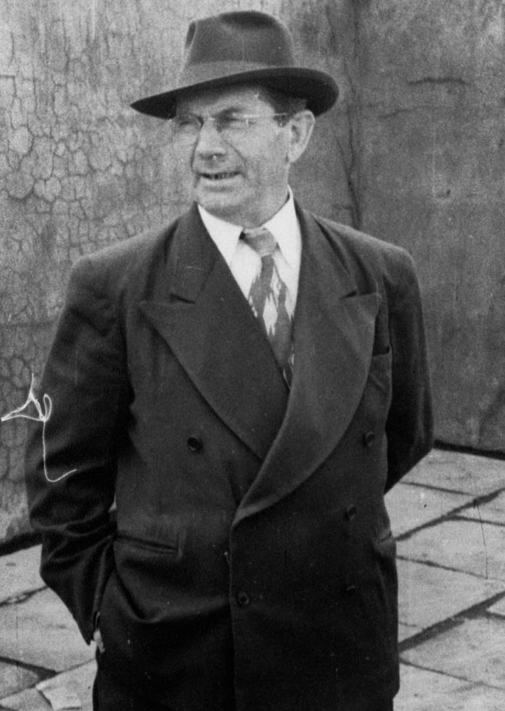 Oddur Ívarsson, skósmiður og póstmeistari á gangi klæddur dökkum tvíhnepptum jakka, ljósri skyrtu, dökku bindi og ber dökkan hatt. Kringlótt gleraugu sitja á nefi hans.