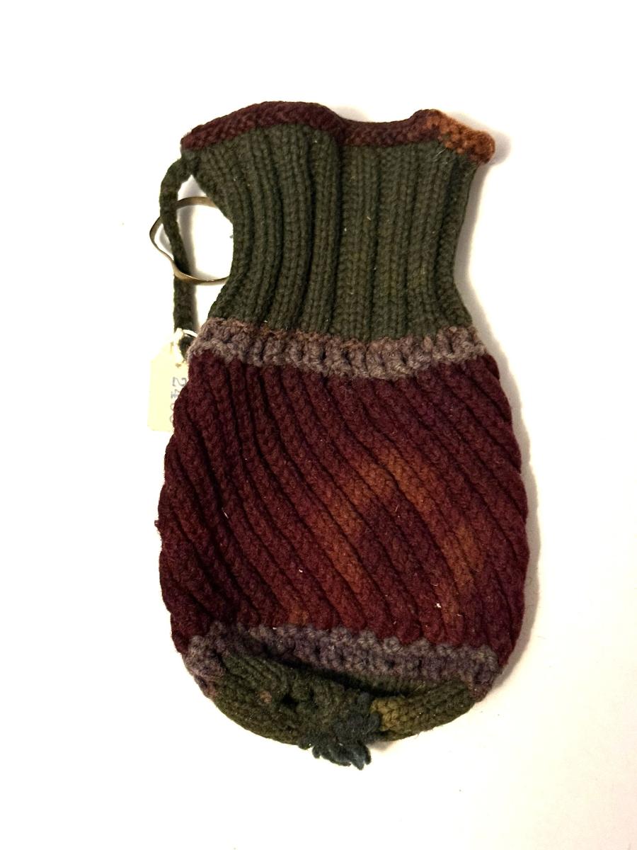 Prjónuð peningapyngja í grænum, fjólubláum og rauðum lit. Brotinn eirhringur er dreginn fyrir opið.