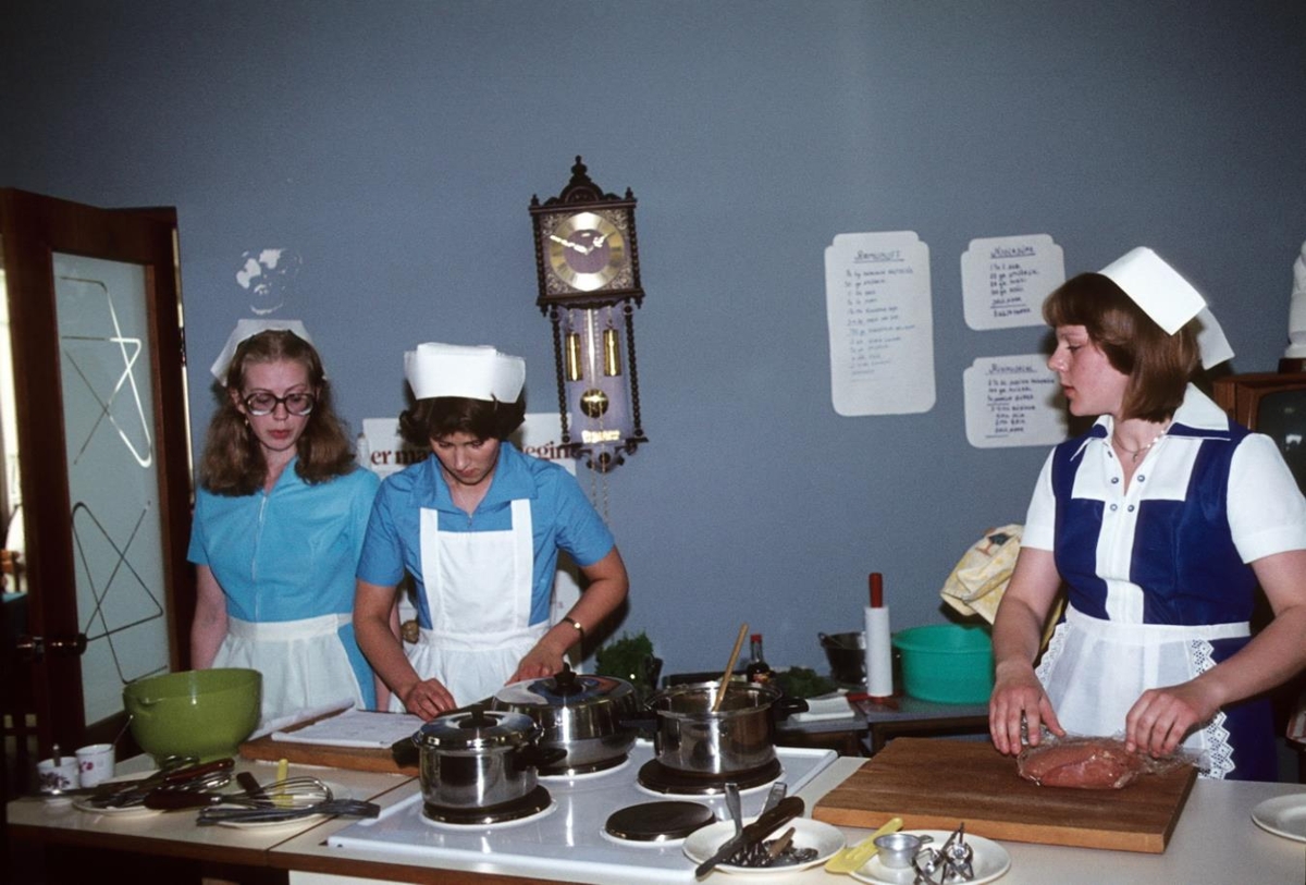 Húsmæðraskólinn. Varmaland. Nemar í skólabúningum við matseld. Þuríður Sveinsdóttir, Ólöf Jósepsdóttir og Sigrún Júlía Kristjánsdóttir. 1977