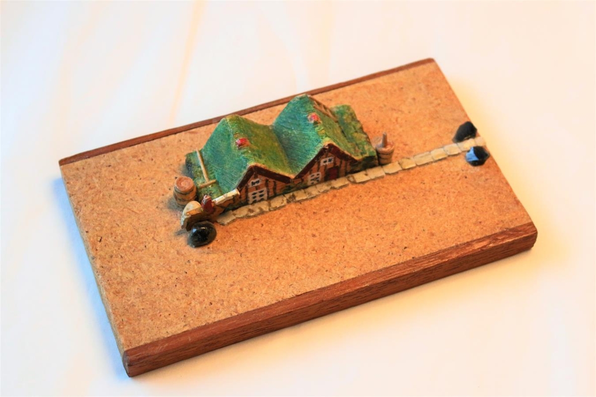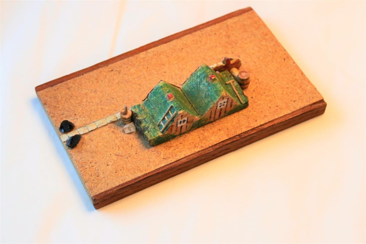 Burstabær með tveimur burstum límdur á viðarplötu. Hestamaður, tunna og strokkur eru fyrir utan, allt úr við.