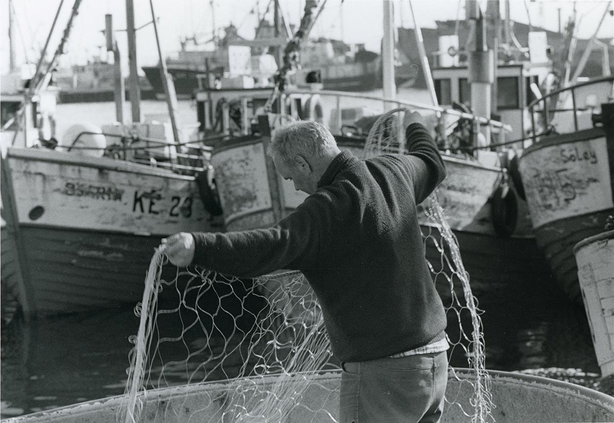 Sveinn Björnsson frá Sunnuhvoli í Garði greiðir úr netum, líklega á bryggjunni í Keflavík.