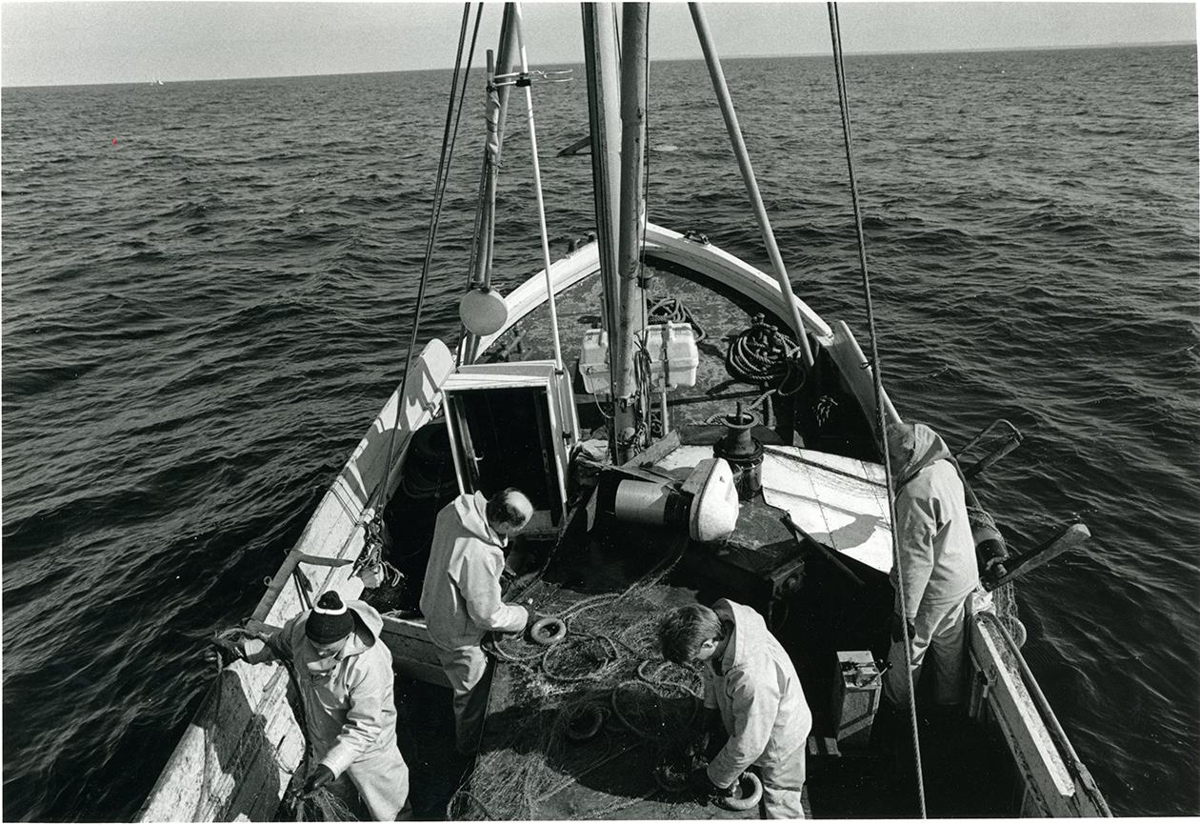 Um borð í Sveini Guðmundssyni GK-315. Ásmundur Björnsson frá Sunnuhvoli, Svavar Óskarsson frá Hvoli, Sveinn Björnsson frá Sunnuhvoli og Kristinn Arnar Pálsson að störfum úti á dekki. Allir búsettir í Garðinum á þessum tíma.