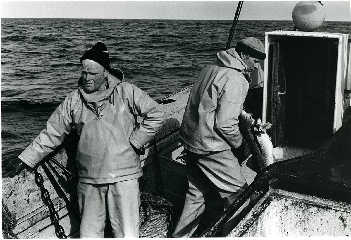 Um borð í Sveini Guðmundssyni GK-315. Ásmundur Björnsson frá Sunnuhvoli í Garði og Svavar Óskarsson frá Hvoli í Garði að störfum úti á dekki.
