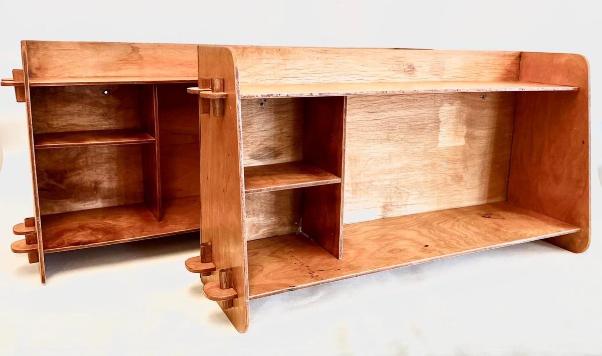 Hilla úr barnaherbergi. Önnur af tveimur eins hillum í uppbyggingu. Hillurnar hannaði og smíðaði Bárður Ísleifsson arkitekt, fyrir börn sín, Margréti og Leif fyrir árið 1950. Stærri hillan var fyrir Margréti sem var eldri. Hillurnar voru í sameiginlegu barnaherbergi þeirra Margrétar og Leifs að Reynimel 25 í Reykjavík en það hús teiknaði Bárður og lét reisa fyrir fjölskyldu sína árið 1946.