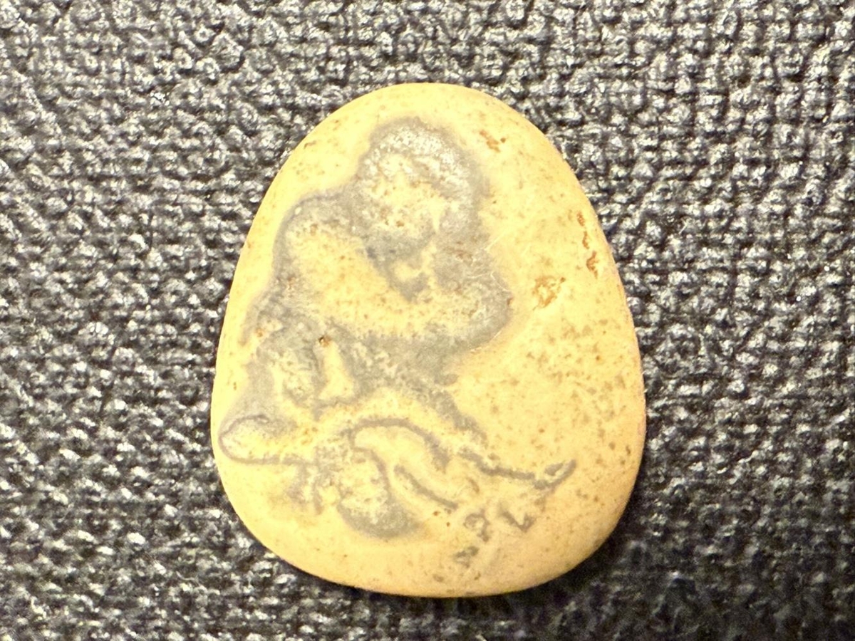 Smásteinn, 1,7x 1,5 cm., mjókkar til annars enda. Hann er ljósleitur, með " mynd " á annarri hliðinni. Sé horft á hana á langveg steinsins, virðist blasa við mynd af konu með barn í fangi, en á þverveg blasir við dýrshaus. Þetta er vafalaust náttúrusmíð, en vegna " myndarinnar " hefur steinninn verið hirtur. Hann fannst í kálgarði á Syðra-Rauðalæk og hefur sennilega borist þangað úr bænum.