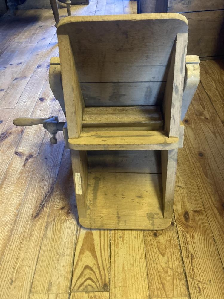 og mjókkar niður, með tréási og sveif, smíðaður úr tré. Ílátið sjálft leikur