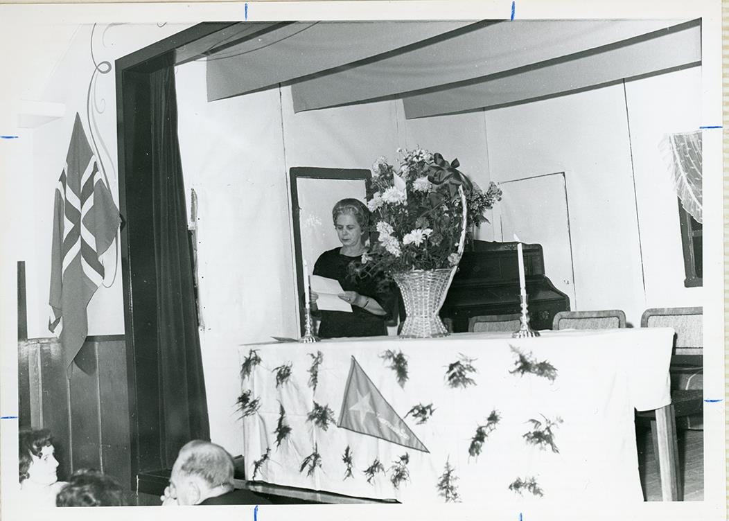 Frá 50 ára afmælisfagnaði kvenfélagsins Gefnar í Garði sem haldinn var í samkomuhúsinu í Garði 9. desember árið 1967. Auður Tryggvadóttir þáverandi formaður kvenfélagsins flytur gestum ávarp.
