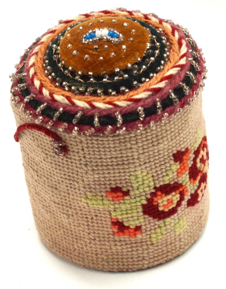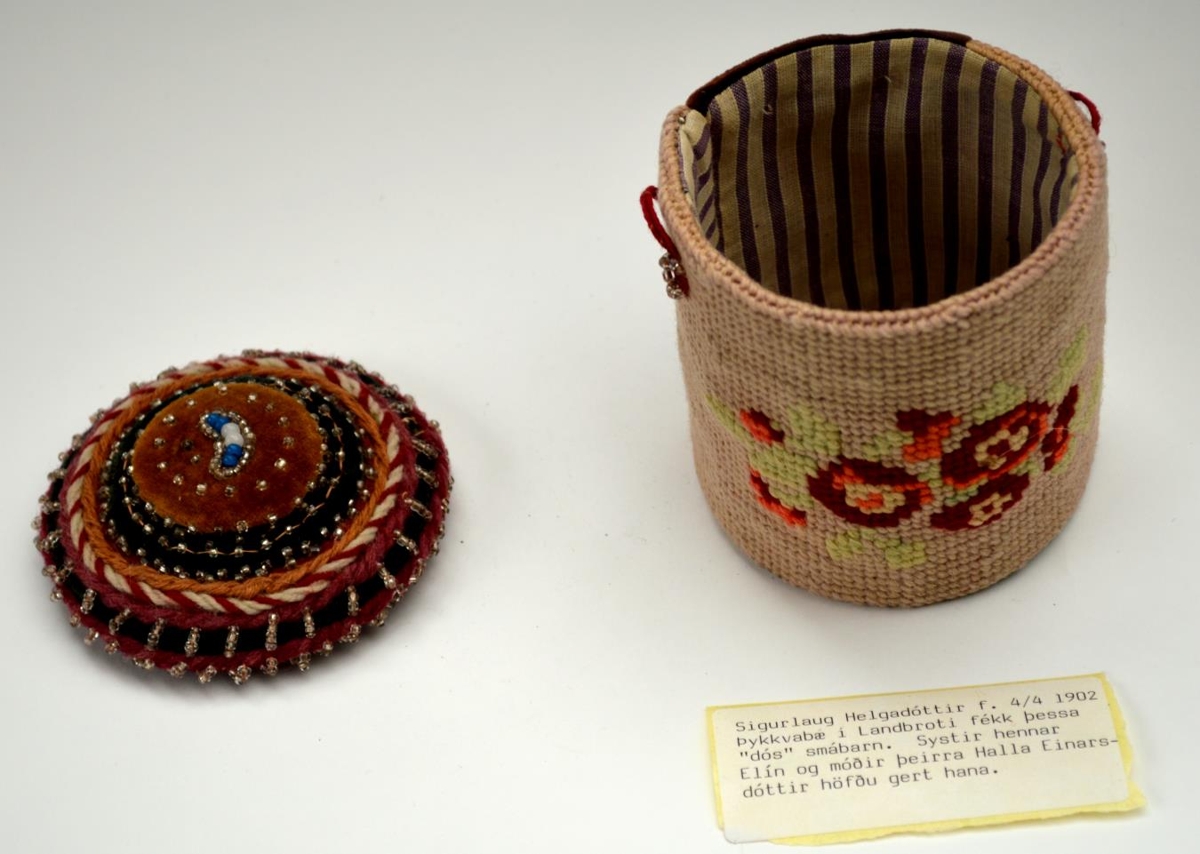 Pappaaskja, tauklædd og með loki, perlusaumuðu. Krosssaumur utan á öskjunni. Úr dánarbúi Sigurlaugar Helgadóttur frá Þykkvabæ að ráðstöfun hennar. Afhent af Elínu Frigg Helgadóttur. Elín systir Sigurlaugar og Halla Einarsdóttir móðir þeirra gerðu öskjuna og gáfu Sigurlaugu smábarni.