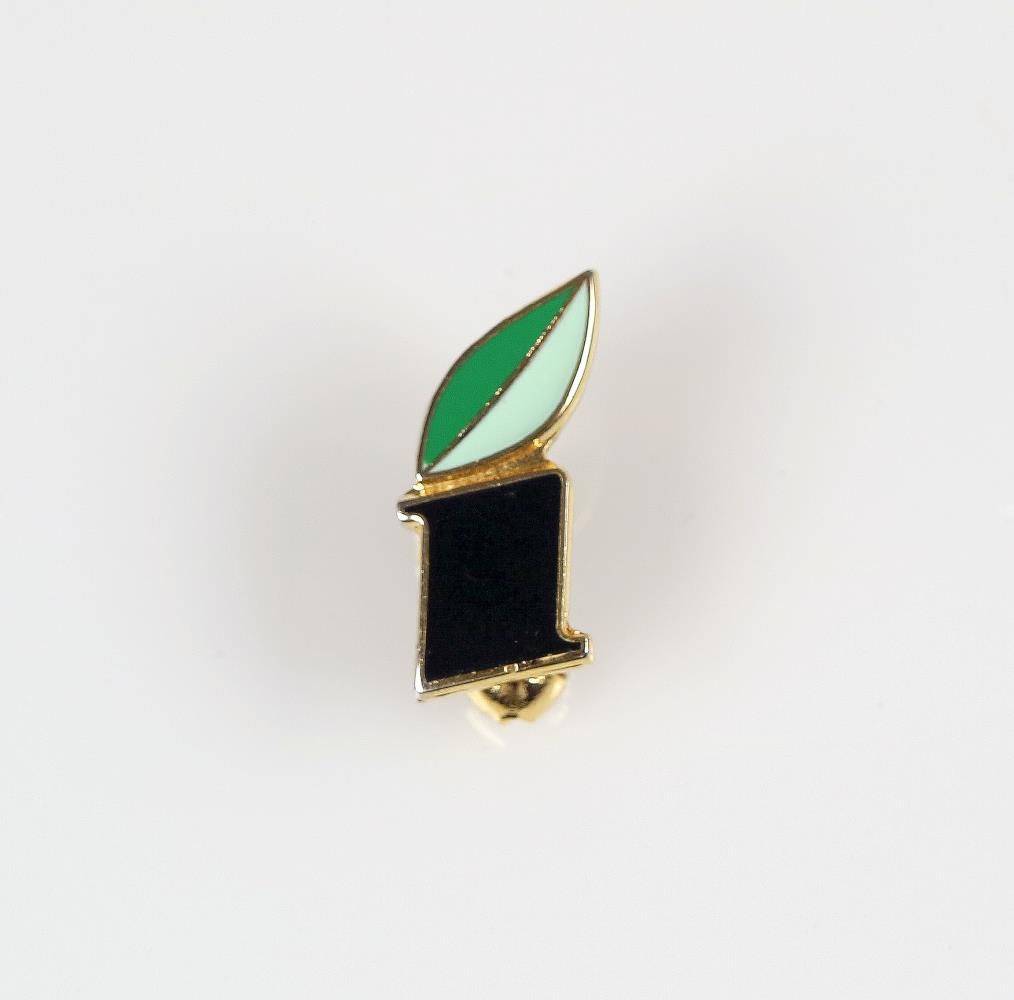 Barmmerki íslenskrar málnefndar/málstöðvar. Lítið gyllt barmmerki með nælu aftan á til að festa í flík. Merkið myndar bókstafinn Í, þar sem leggur bókstafsins er í líkingu svartrar blekbyttu og komman er eins og grænn fjaðurstafur.
