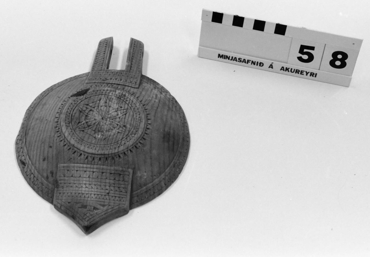 útskurði, ekkert ártal. Smíðað af Birni Guðmundssyni, síðast bónda