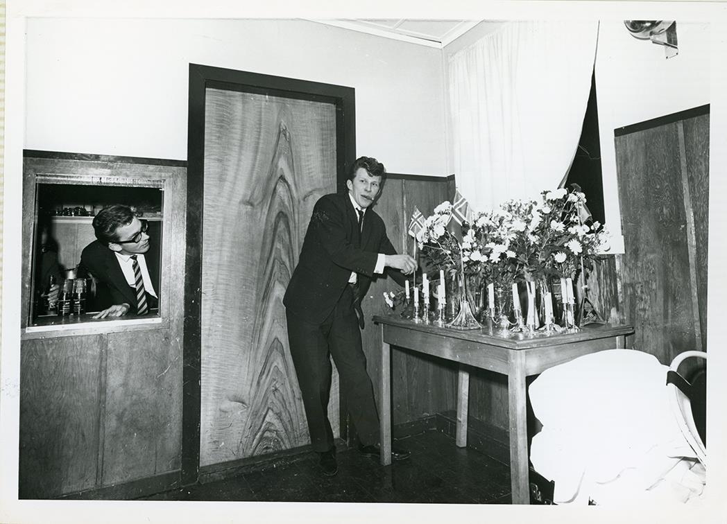 Frá 50 ára afmælisfagnaði kvenfélagsins Gefnar í Garði sem haldinn var í samkomuhúsinu í Garði 9. desember árið 1967. Þeir hafa líklega verið að aðstoða í veislunni. Finnbogi Björnsson frá Gerðum í lúgunni og Sigurður Ingvarsson frá Bjargi að ganga frá kertastjökunum.
