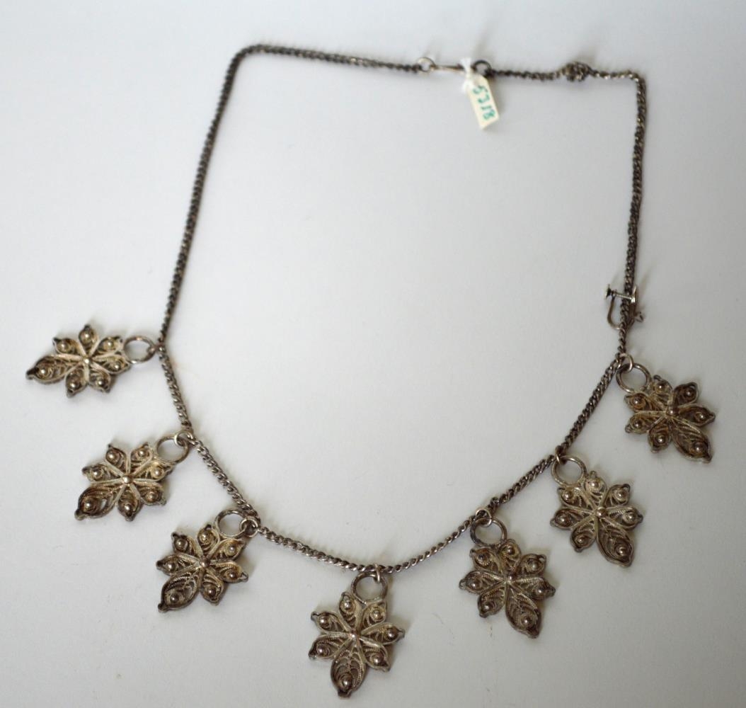 Sjö silfurmillur (víravirki) frá upphlut og gerð úr hálsfesti. Gefið af Guðnýju og Hönnu Helgadætrum, Byggðarenda 15, Reykjavík.