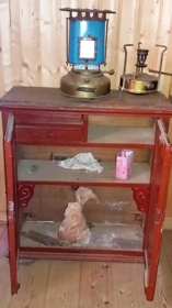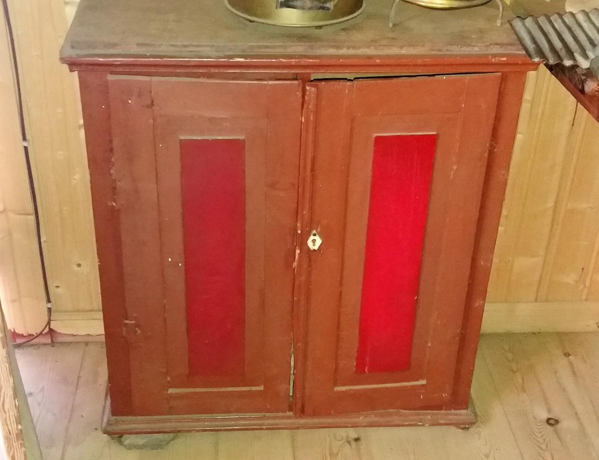Skápur með vængjahurðum, að mestu brúnmálaður, lítilsháttar útskurður bak við hurðir (kverkarskreyting). Tígullaga skráarlauf. Skápurinn er með þremur hillum og hliðarskúffur tvær eru felldar inn í efstu hillu. Smíðaður af Sigurði Ólafssyni frá Blómsturvöllum o.v. f. 1860, d. 1903.Plata ofan á sett síðar á. Er úr kistu eftir Ólaf Þórarinsson, d. 1840, en kistan var tekin sundur á þessari öld. Gefið af Ragnhildi og Páli Þorvarðarbörnum á Dalshöfða í Fljótshverfi.