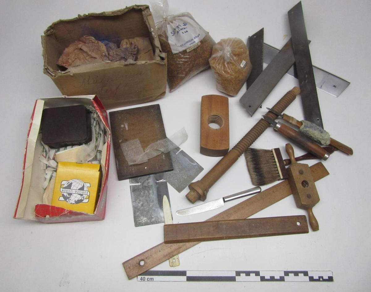 Kassi undan Vodka Wybrowa. Inniheldur muni til bókbands, lím, snitttappa, snittteina úr tré, pensil, blaðamát (4), mælistikur (2) o.fl. item málningarduft.