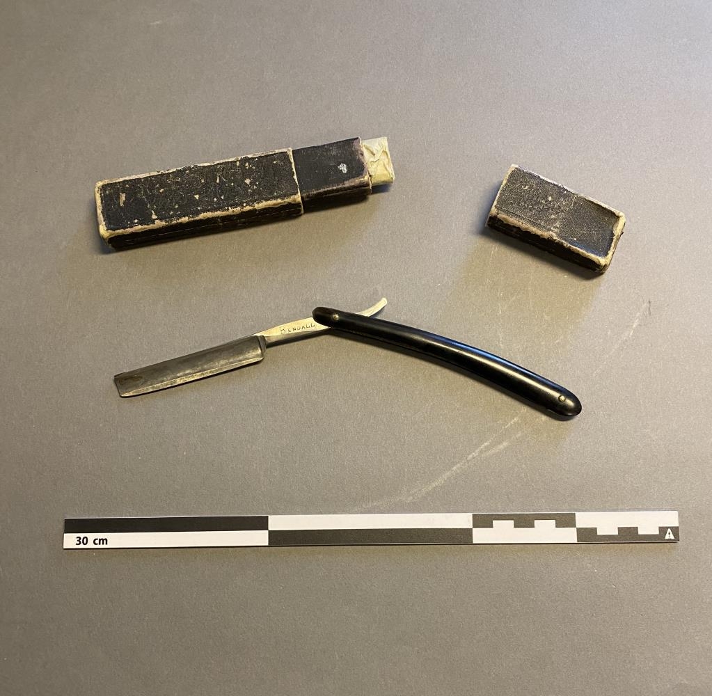 Rakhnífur sr. Skúla Skúlasonar prests í Odda á Rangárvöllum. Framleiðandi T.R Cadman & sons, Sheffield, England. Tegund Bengall. Á öskjunni stendur H.V Jensen, Köbenhavn.