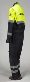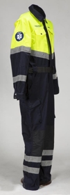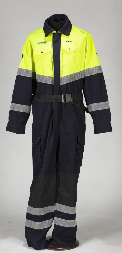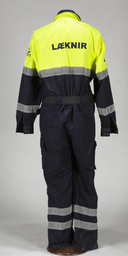 Einkennisfatnaður læknis á neyðarbíl. Búningur er dökkblár og skær gulur að lit með endurskinsborðum. Framan á búningnum vinstra megin er saumað í fatnaðinn: Landspítali háskólasjúkrahús, til hægri er saumað í fatnaðinn: JÓN B. Á annarri ermi er saumað: Landspítali háskólasjúkrahús og merki spítalans og á hina ermina er saumað kringlótt merki sem samanstendur af bláum hring með einkennistákni læknisfræðarinnar, slanga sem hringar sig utan um staf inni í stjörnu (star of life). Aftan á búninginn er saumað: Læknir. Á búningnum er belti með plastsmellu og á buxnaskálmunum sitt hvorum megin eru vasar með smellu. Miði innan í galla er alveg máður. Í sömu gjöf voru einnig gripir númer: Þjms. 2022-37-1, Þjms. 2022-37-2, Þjms. 2022-37-3