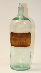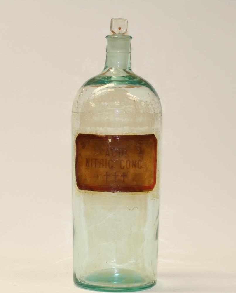 Flaska, glær með grænni slikju og glertappa. Merkt Acid Nitric conc. +++