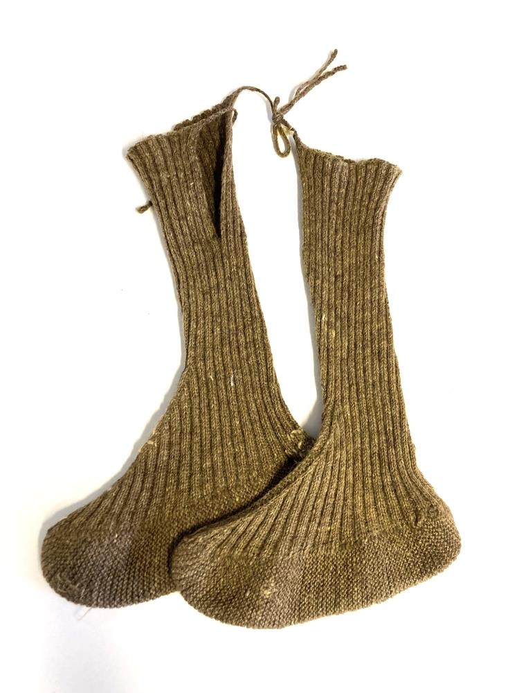 Reiðsokkar, mórauðir. Sólinn prjónaður með garðaprjóni en rist og leggur með brugðnu prjóni. Klauf ofan í stroffið. Tengsli fest í stroffið. Þetta er verk Ragnhildar Guðbrandsdóttur á Hraunbóli á Brunasandi nú á Álfhólsvegi 27, Kópavogi.