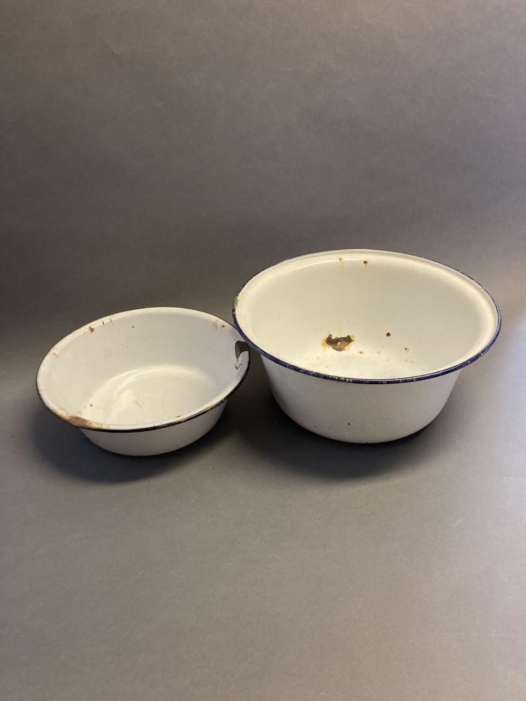 Vaskaföt 2 stk. úr emeleruðu járni. Hvít á litinn með blárri rönd. Stærra vaskafatið er 11,5 cm hátt, þvermál 28 cm. Minna vaskafatið er 7 cm hátt, þvermál 22,5 cm. Undir botni stærra vaskafatsins er grafið: "Made in Czechoslovákia, JII 28cm". Glerungur nokkuð skellóttur.