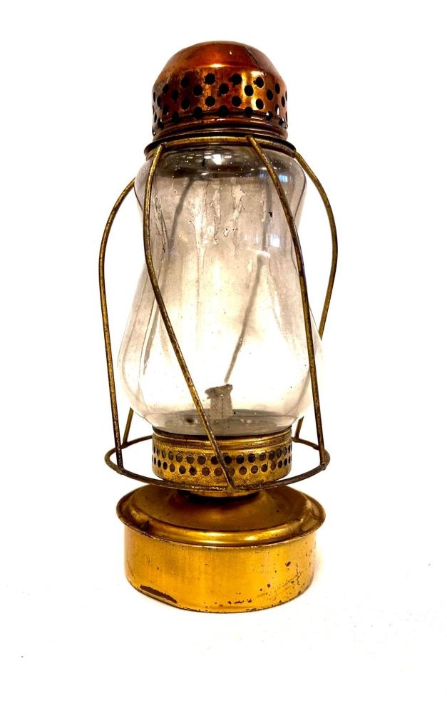 Lítill olíulampi með grind í kringum lampaglasið.